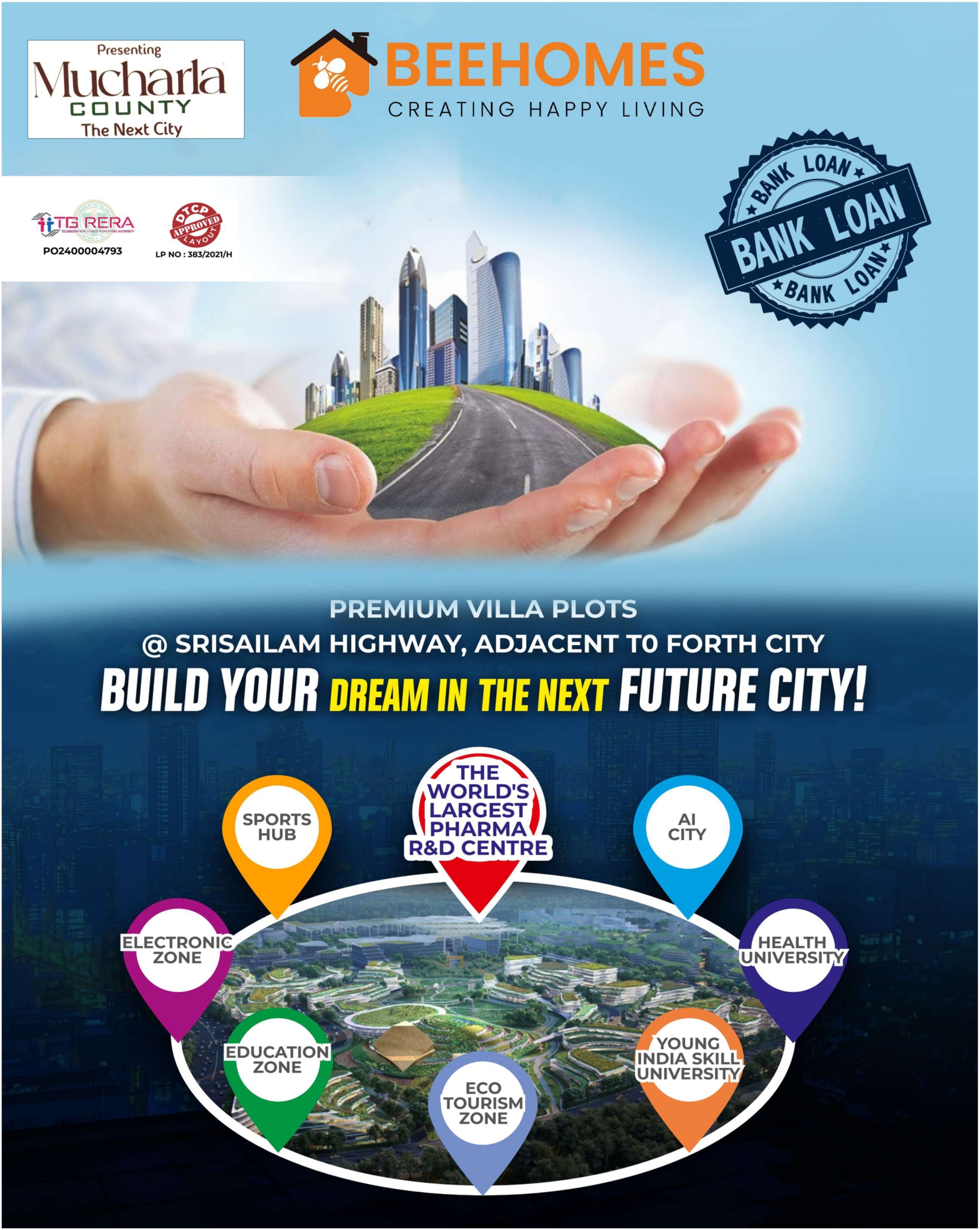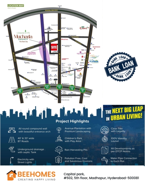 Mucharla County is a premium plotted development located right next to the highly anticipated Forth City on Srisailam Highway, in proximity to the Regional Ring Road (RRR) and Pharma City. This futuristic layout is DTCP and RERA approved, ensuring complete legal transparency and investment security. With seamless access to Hyderabad’s evolving growth corridors, this is your opportunity to own a plot in the city of tomorrow!