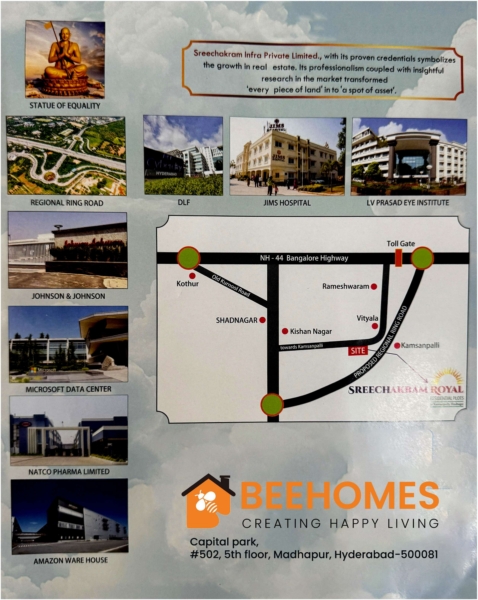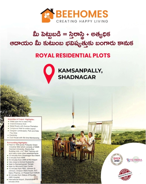 🌟 Project Overview: BEEHOMES introduces “Royal Residential Plots,” a meticulously planned venture located in Kamsanpally, Shadnagar. This project is envisioned as an ideal investment for families seeking not just a plot of land, but a future filled with peace, prosperity, and significant returns. Sreechakram Infra Private Limited, with its proven credentials, ensures that every piece of land in this project transforms into a valuable asset.